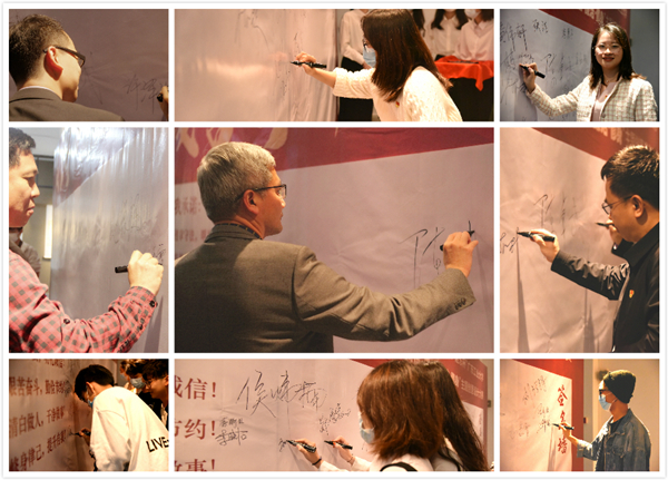 在“践言行动”签名环节,参与活动的领导嘉宾和同学们郑重签下自己的姓名,带头践行诚信、勤俭、廉洁、修身的庄严承诺。