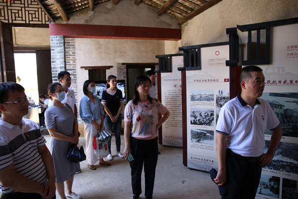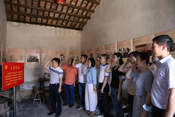 活动最后一站来到了大岭山抗日根据地旧址。一处处文物旧址,一幅幅珍贵的照片,一段段翔实的历史记录,党员们仿佛置身于革命年代的峥嵘岁月。 1940年10月,广东人民抗日游击队东江纵队的前身之一——广东人民抗日游击队第三大队,挺进东莞大岭山区,在大王岭村设立部队领导机关,创建大岭山抗日根据地,开展敌后游击斗争,曾取得百花洞战斗的胜利,粉碎日伪军"万人大扫荡",沉重地打击了日伪军,有力地支援了华南地区及全国的抗日战争。在大队部旧址所在处,党员们面向鲜红的党旗,进行了重温入党誓词宣誓仪式,接受革命理想信念教育,感悟共产党人和革命先烈的初心使命,弘扬东江纵队的革命精神。