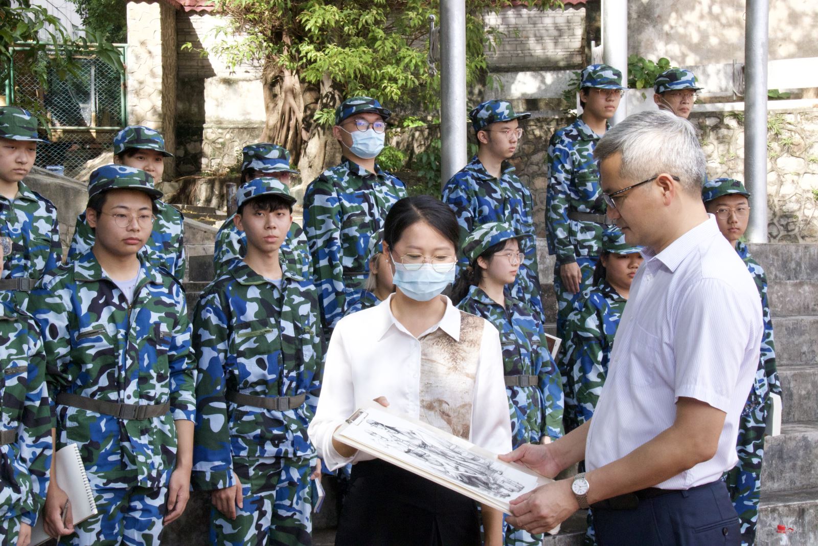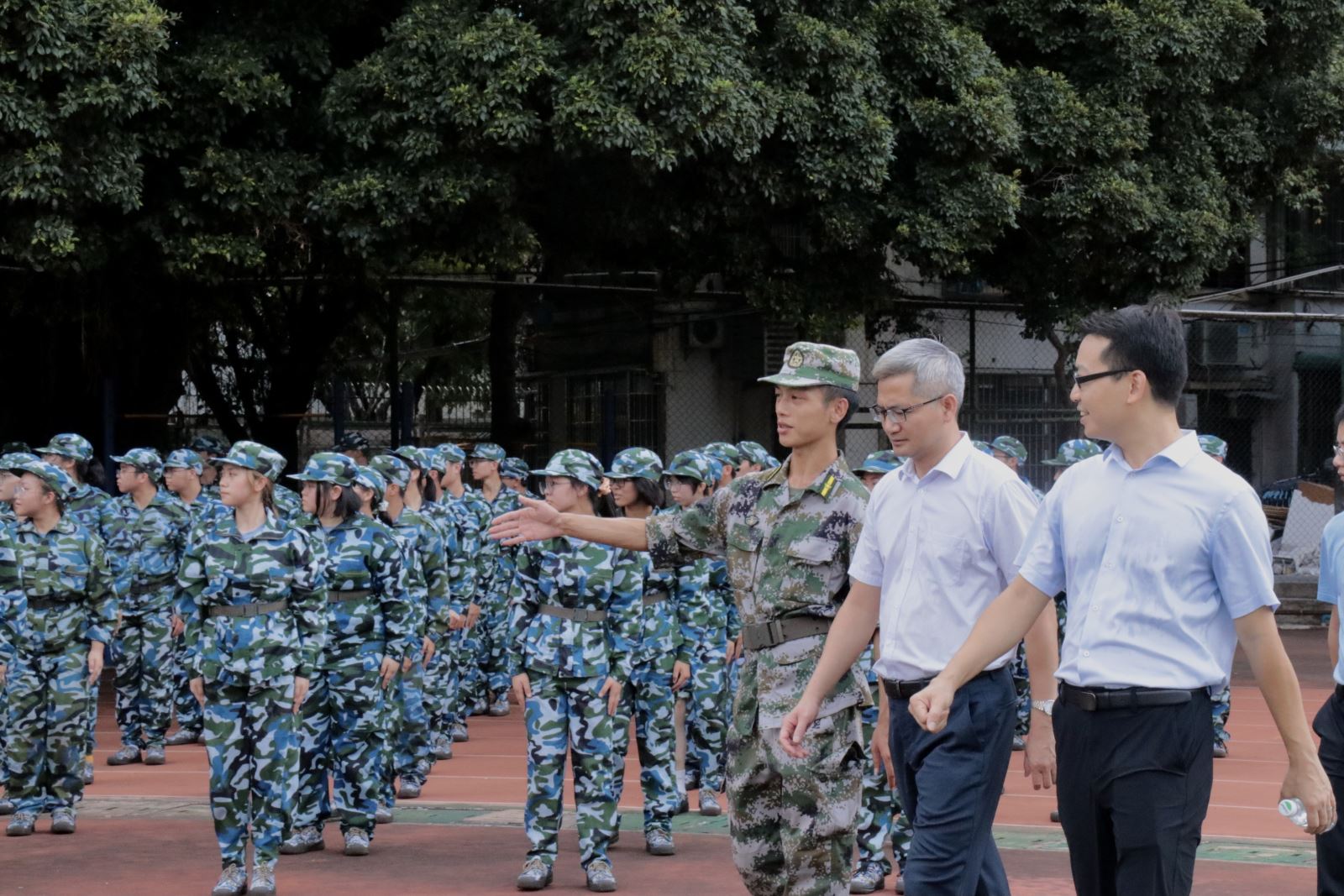 陈卓武副校长亲切慰问了承训教官,并仔细询问了新生军训情况,对新生饱满的军容面貌给予肯定。他高度赞扬了新生不畏酷暑、不惧艰难、坚持军训的可贵精神,叮嘱同学们要严格遵守军训要求,做好疫情防护和防晒防暑,继续发扬优良作风,厚植家国情怀,以更加昂扬的姿态投入训练。陈卓武副校长特别慰问了因身体不适和受伤无法参训的新生,对他们通过自己手中的画笔、相机记录和描绘军训事迹的方式参加国防教育的做法表示肯定。随后,陈卓武副校长逐一巡查了各个服务点,详细了解医疗、防疫防暑、饭堂就餐、饮用水供应等后勤保障工作,要求学院强化军训期间的思想引领和人文关怀,辅导员老师全程跟进、分类管理、细化服务。