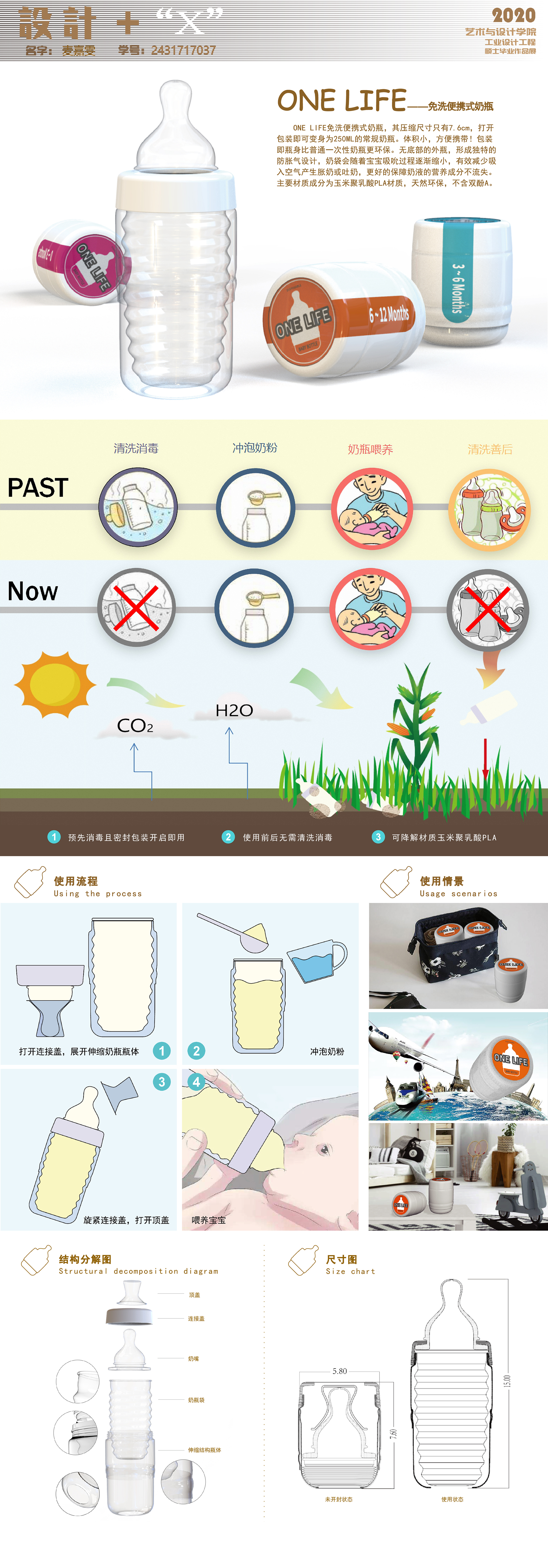 ONE LIFE免洗便携式奶瓶,其压缩尺寸只有7.6cm,打开包装即可变身为250ML的常规奶瓶。体积小,方便携带!包装即瓶身比普通一次性奶瓶更环保。无底部的外瓶,形成独特的防胀气设计,奶袋会随着宝宝吸吮过程逐渐缩小,有效减少吸入空气产生涨奶或吐奶,更好的保障奶液的营养成分不流失。材质的主要成分为玉米聚乳酸PLA材质,天然环保,不含双酚A。