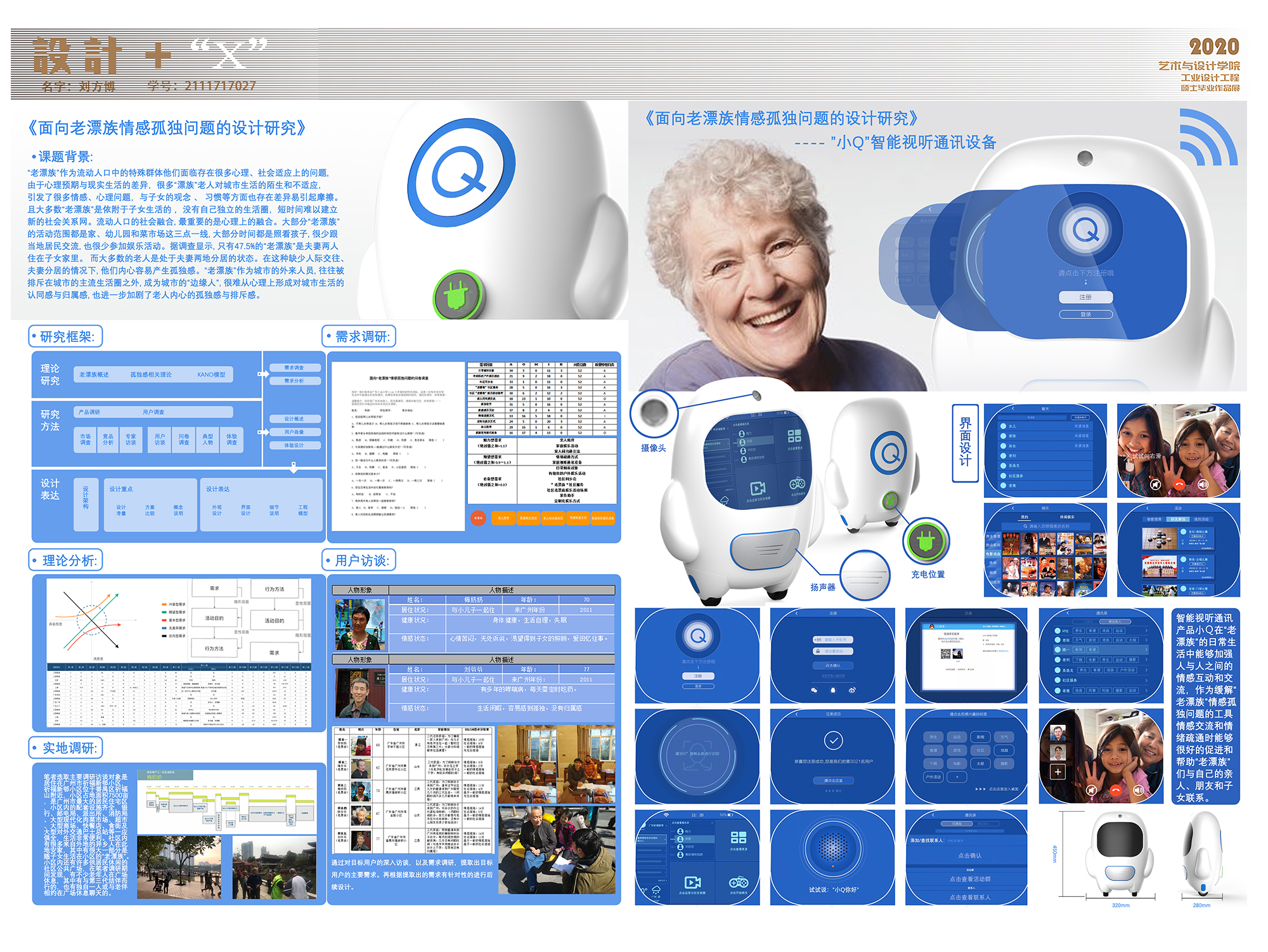 智能视听通讯产品小Q是专门针对“老漂族”群体去设计的产品,产品主色为白色辅色为蓝色,造型灵感来源于一款即时聊天应用LOGO,也旨在产品本身是一款主打聊天功能的智能产品,产品通体选用PVC塑料,一体成型加工工艺,产品由上端的显示屏和产品下方的扬声器以及产品充电口组成,显示屏作为信息输入和输出的端口,其承载了产品所有线上功能。用户在与产品进行交互时大部分的反馈都来源于显示屏,但产品也会通过扬声器在会用产品时利用声音来与用户进行互动。