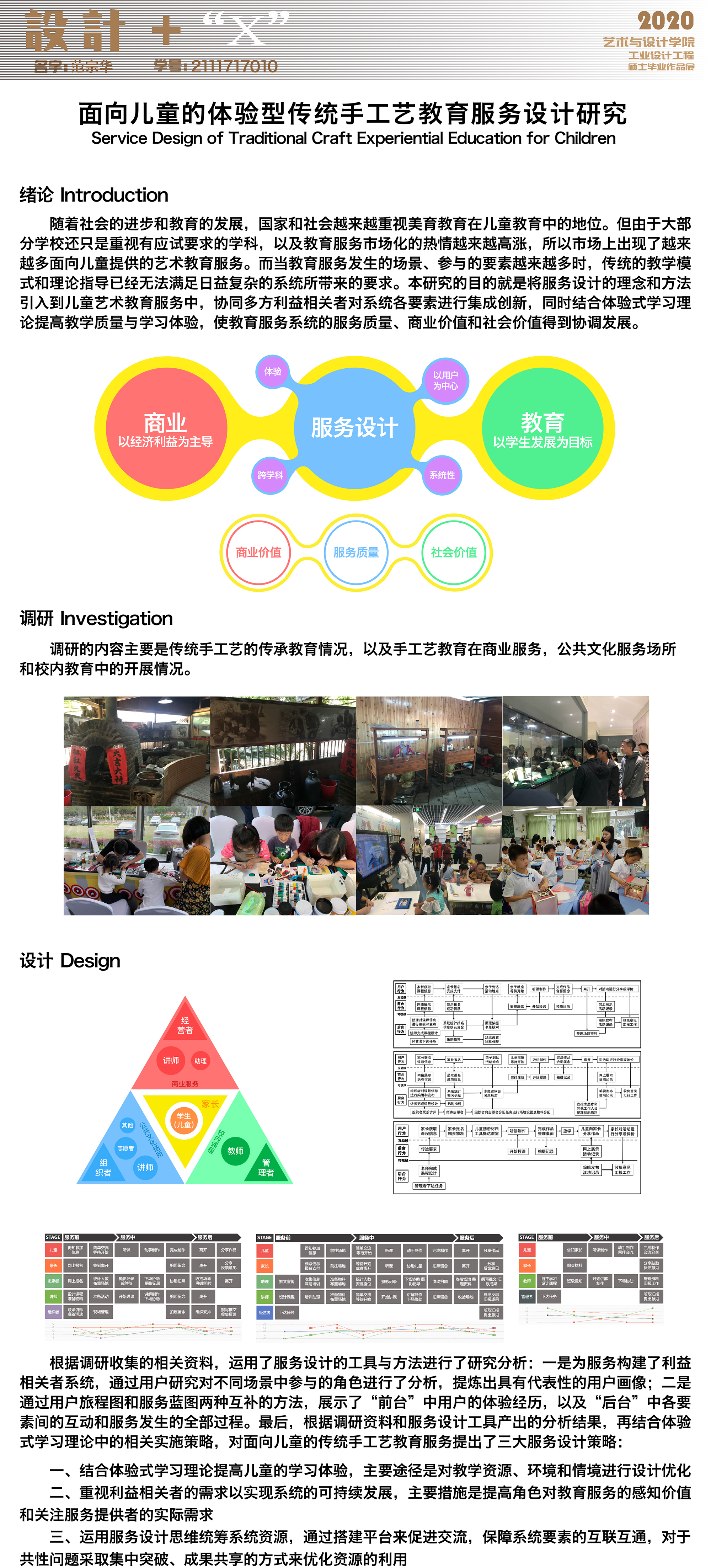 本课题将服务设计的理念和方法引入到儿童艺术教育服务中,协同多方利益相关者对系统各要素进行集成创新,同时结合体验式学习理论提高教学质量与学习体验,对面向儿童的传统手工艺教育服务提出了三大服务设计策略:一是结合体验式学习理论提高儿童的学习体验;二是重视利益相关者的需求以实现系统的可持续发展;三是运用服务设计思维统筹系统资源。以此来促使教育服务系统的服务质量、商业价值和社会价值得到协调发展。