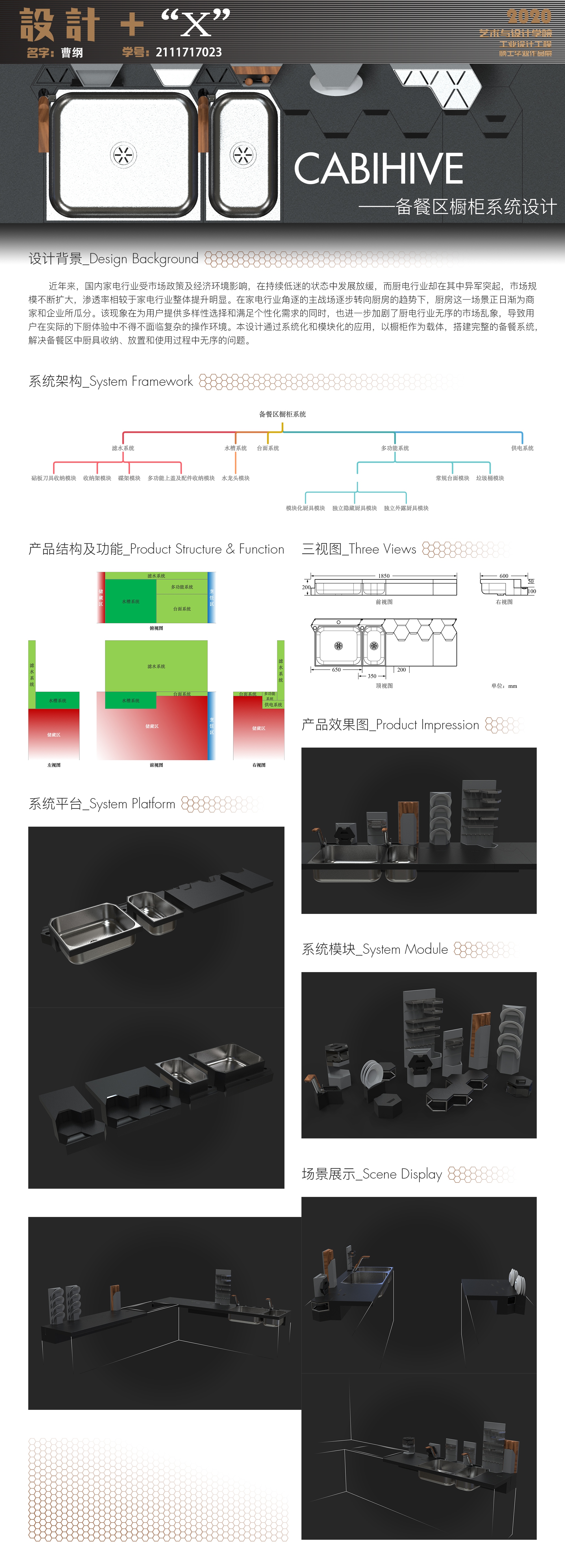备餐区橱柜产品形态为“台面+内柜+墙面”,橱柜作为系统的核心平台,主要采用隐藏式模块化设计,以确保在常规使用的过程中与现有备餐区形态基本保持一致。在对模块进行倾倒或清洗操作时,可轻松将模块取出。既能够保证台面的整洁度,又不破坏系统功能的完整性。该系统包括收纳系统、水槽系统、台面系统、多功能系统、滤水系统和供电系统六部分,各系统全部采用模块化形式连接至系统平台,其中多功能系统涵盖了大部分的食材料理功能,解决了备餐区中橱柜与厨具相互分离割裂、各成一体的无序状态,同时,整个备餐区的水电相互串联构成系统,进一步优化了用户的备餐体验,提升了备餐效率。