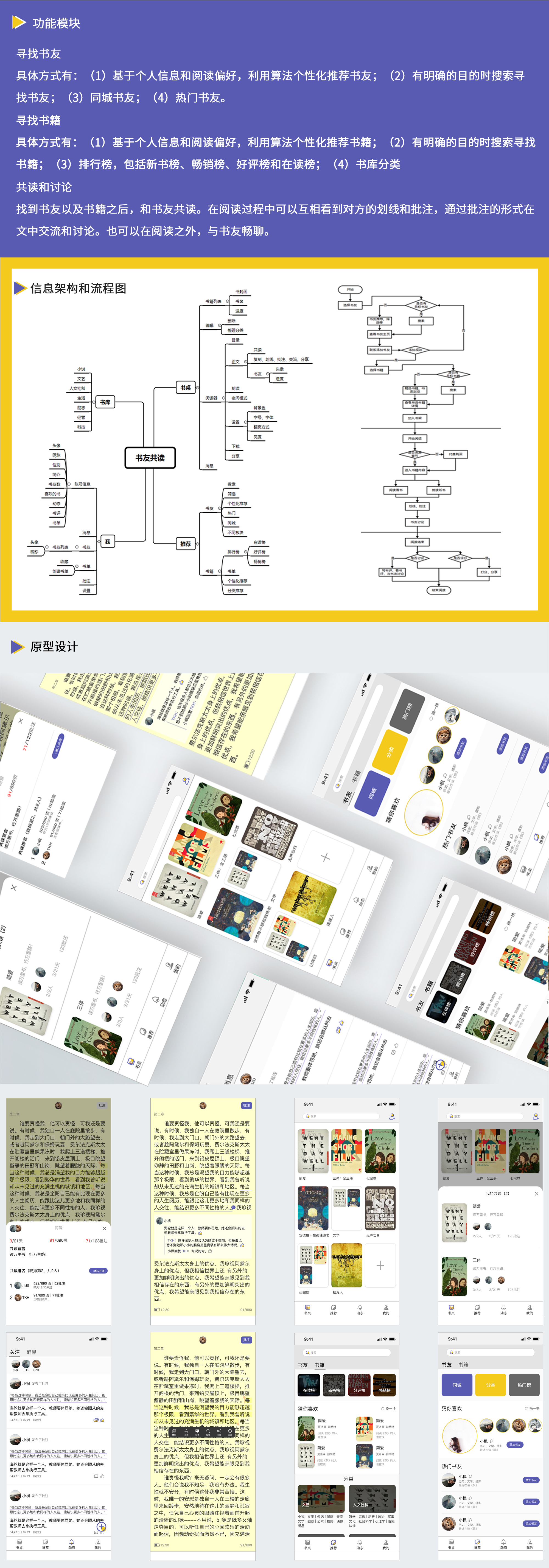 根据心理模型无意识设计原则,基于现实生活中的“书友”心理模型,借用用户的现实经验和内隐记忆来进行无意识设计。现实生活中,人们以书为媒介结交志同道合的书友,共读、探讨、寻求精神共鸣。但是,在如今的快速化信息时代,更多人热衷于短视频、漫画等直观的文化和娱乐方式。而阅读需要投入更多的时间和精力,尤其是深度阅读。生活中找到书友共读的机会越来越少。“书友·共读”提供一个以阅读寻找精神同好的平台,在浮躁喧嚣的当下,邂逅书友,共读一本书,分享交流感悟。以书为媒介,碰撞彼此的思想,收获精神相投的好友。