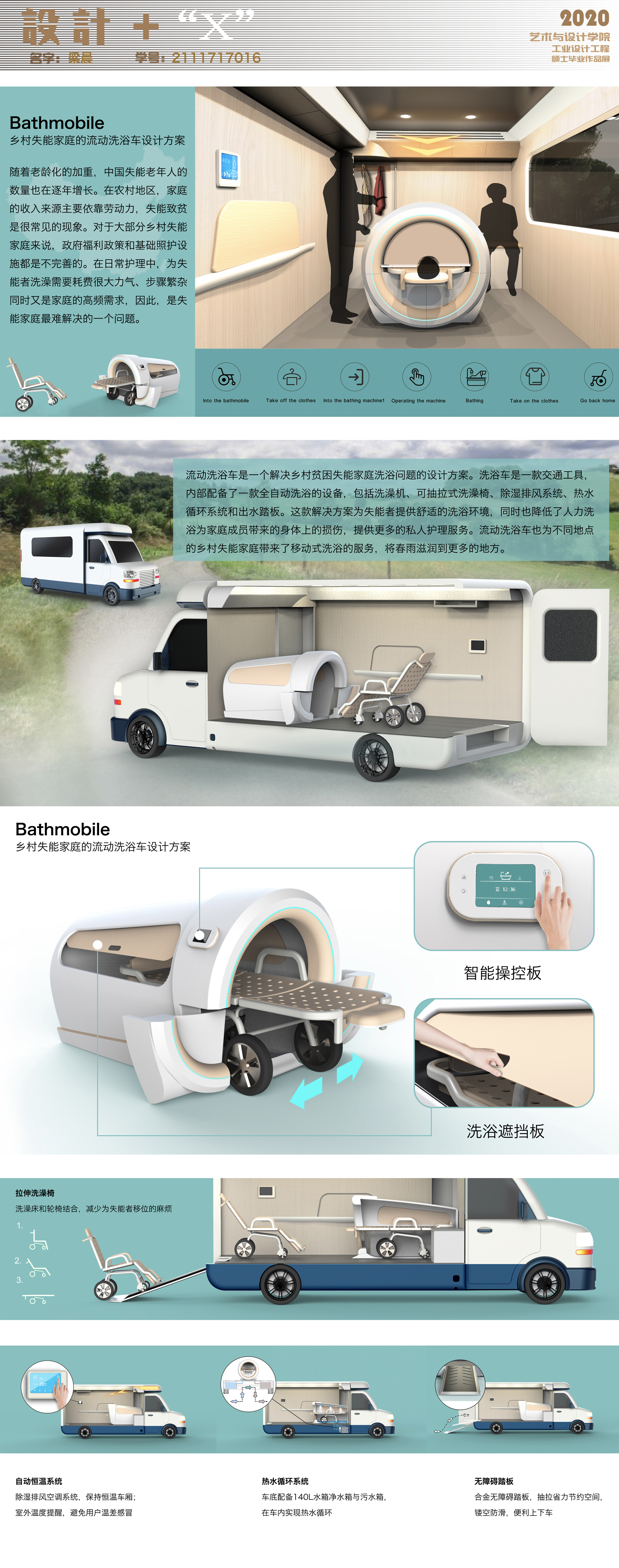 乡村失能家庭的流动洗浴车设计方案旨在解决乡村贫困失能家庭的洗浴问题。洗浴车是一款可洗浴的移动交通工具,内部配备了一款全自动洗浴的设备,包括洗澡机、可抽拉式洗澡椅、除湿排风系统、热水循环系统和出水踏板。这款解决方案为失能者提供舒适的洗浴环境,同时也降低了人力洗浴为家庭成员带来的身体上的损伤,提供更多的私人护理服务。流动洗浴车也为不同地点的乡村失能家庭带来了移动式洗浴的服务,将春雨滋润到更多的地方。