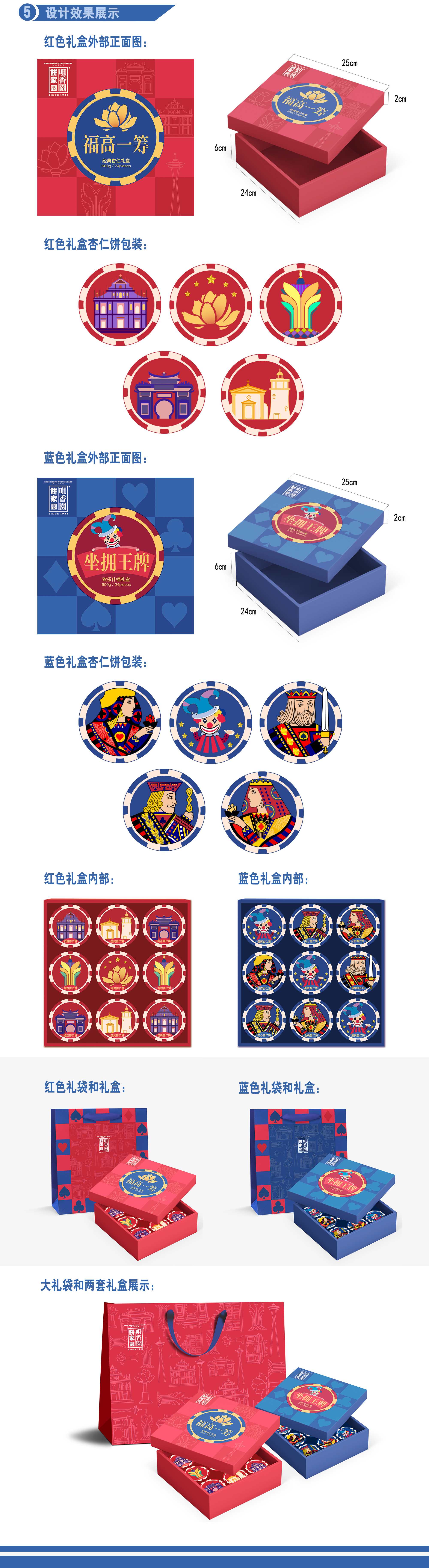 根据澳门中西文化融合概念,本设计包括两份礼盒,一份以中式元素为主,辅以西式,为红色调礼盒;一份以西式元素为主,辅以中式,为蓝色礼盒。可单独售卖,也可组成大的礼品装一起售卖,满足消费者不同需求。元素提取上运用线描使元素得到形态上的整合,同时保留典雅的文化感;扁平化风格处理,增强现代视觉感。杏仁饼包装利用筹码造型与其视觉上的相似性,把两者巧妙结合,打造娱乐化效果。选定“筹码”和“王牌”的元素,寓意吉祥符合人们购买手信的美好意愿,同时打破传统老字号手信的视觉元素,赋予手信更多“活力”。红色礼盒命名为“福高一筹”,蓝色礼盒命名为“坐拥王牌”,突破传统老字号礼盒命名思维,使手信印象更为年轻化。