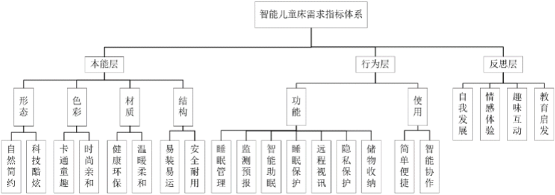 根据需求指标体系构建的原则,基于情感化设计三层次理论构建需求评价指标体系,根据指标体系中的所得到的指标和客观量化的数据信息反馈指导设计进行。一床一宇宙,守护儿童的健康。既是以用户使用儿童床的目的最终需求——保障儿童睡眠健康,让孩子健康成长为产品市场的切入点,符合人们由于生活质量的提高,对睡眠健康的愈发重视的要求;同时,也是顺应目前“互联网+”健康大潮下的,具备发展智能健康生态的潜力,适合产品后续的发展和智能家居生态的建立。