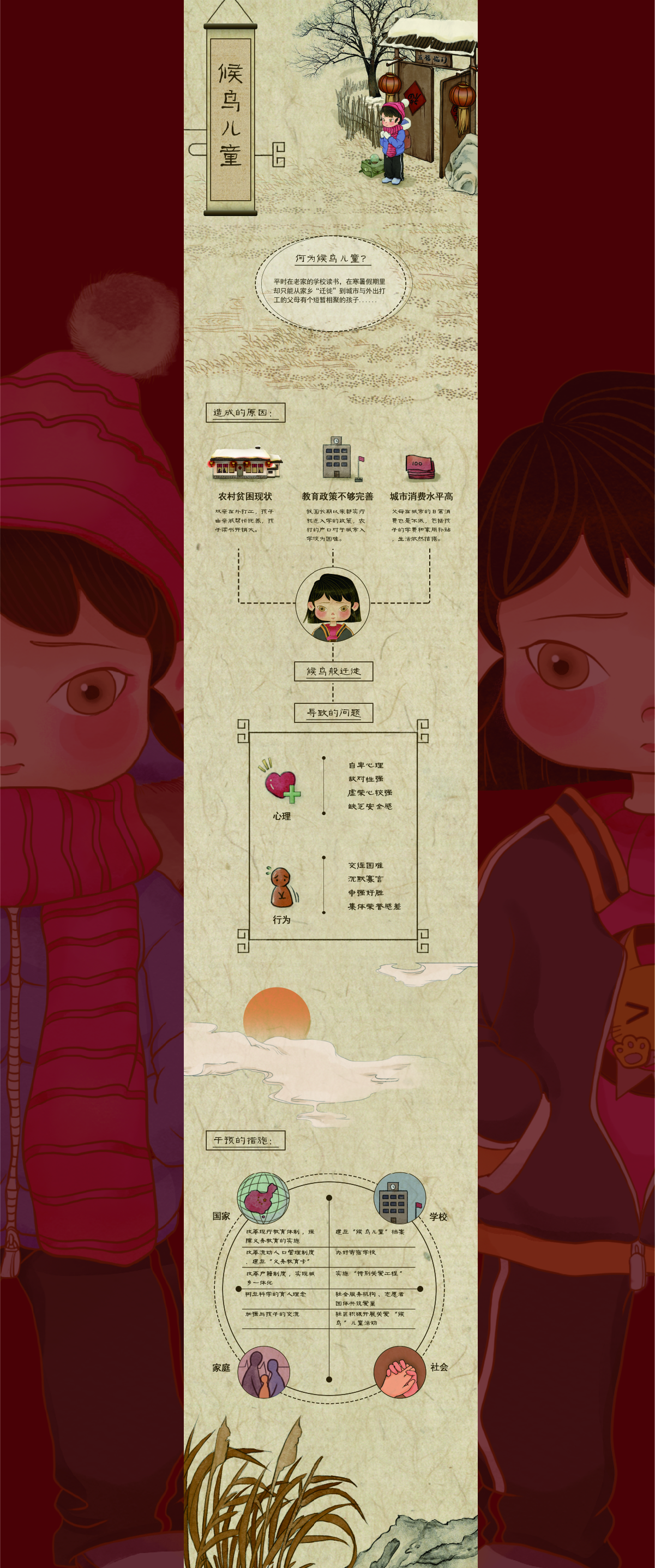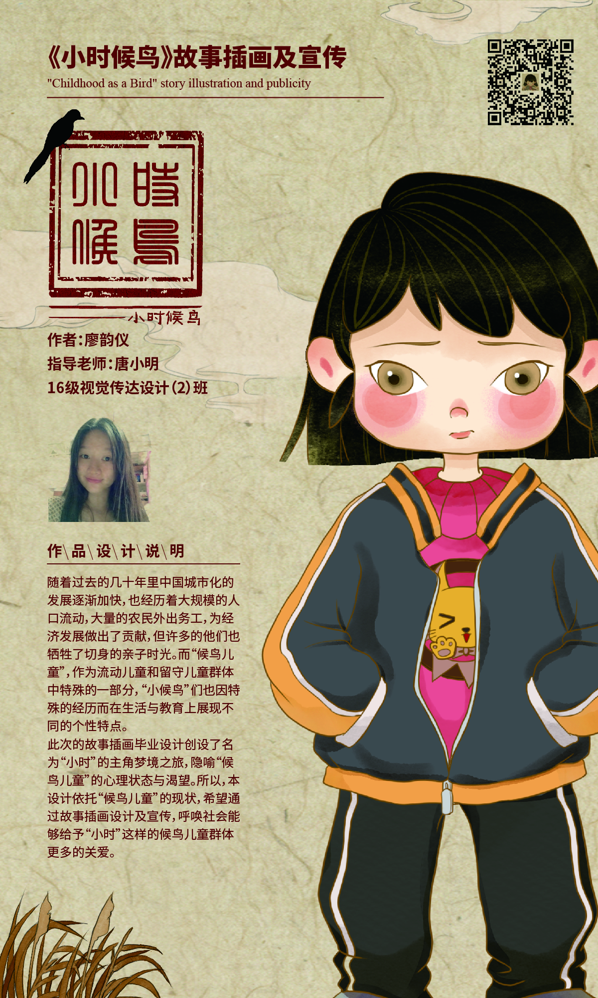 随着过去的几十年里中国城市化的发展逐渐加快,也经历着大规模的人口流动,大量的农民外出务工,为经济发展做出了贡献,但许多的他们也牺牲了切身的亲子时光。而“候鸟儿童”,作为流动儿童和留守儿童群体中特殊的一部分,“小候鸟”们也因特殊的经历而在生活与教育上展现不同的个性特点。此次的故事插画毕业设计创设了名为“小时”的主角梦境之旅,隐喻“候鸟儿童”的心理状态与渴望。所以,本设计依托“候鸟儿童”的现状,希望通过故事插画设计及宣传,呼唤社会能够给予“小时”这样的候鸟儿童群体更多的关爱。
