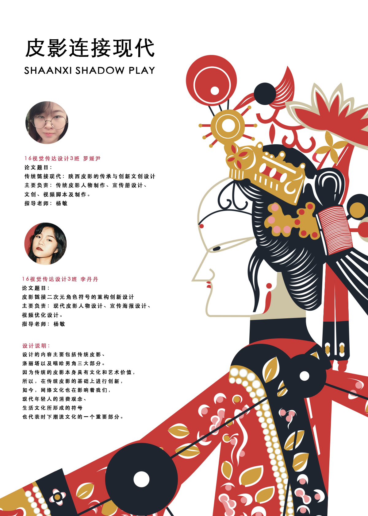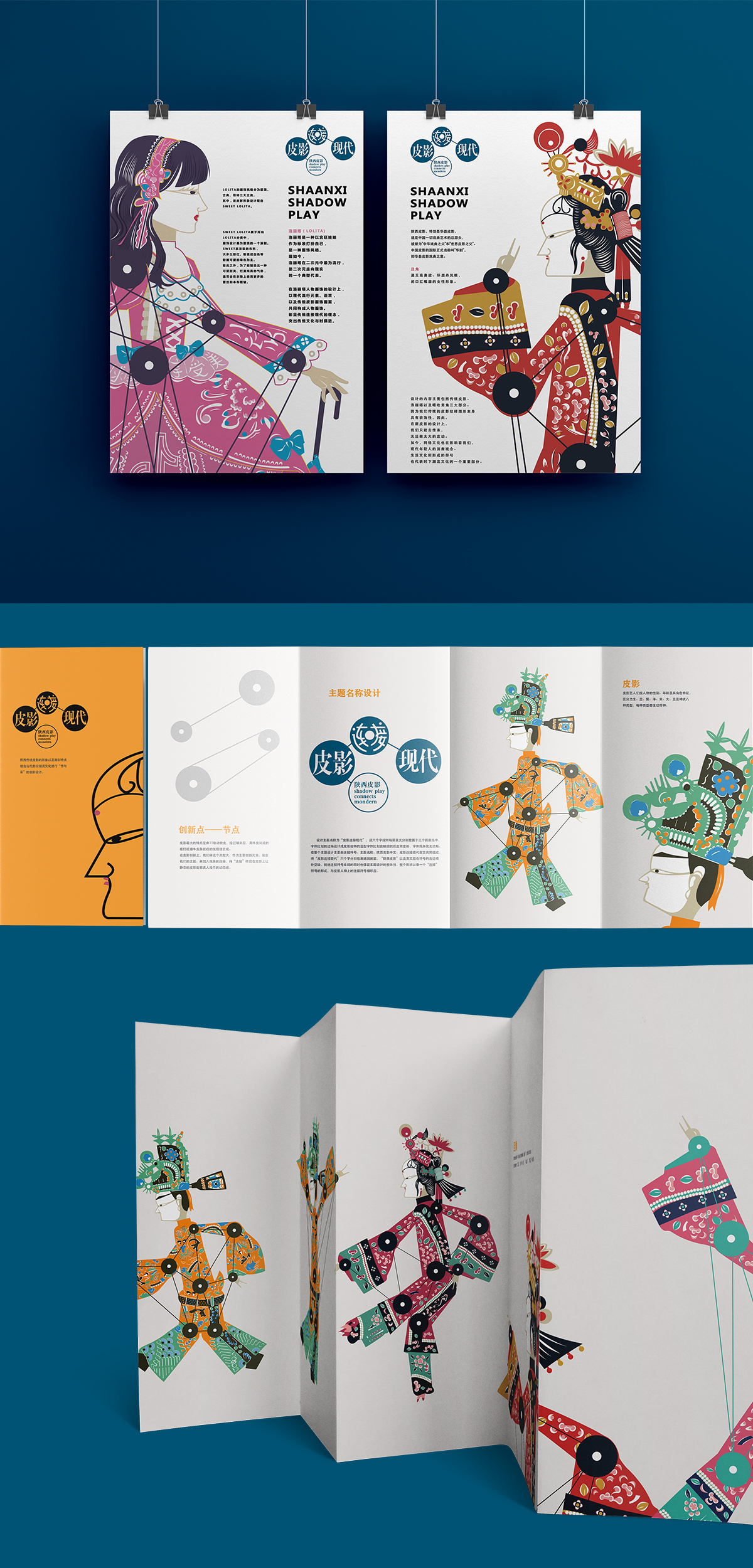 本次毕业设计选取了陕西皮影作为设计内容,目的在于传承中国非遗文化,使传统文化融入现代潮流,重回大众视野。设计作品以文化创意设计的表现形式,结合现代扁平风格和色彩风格进行创新设计。