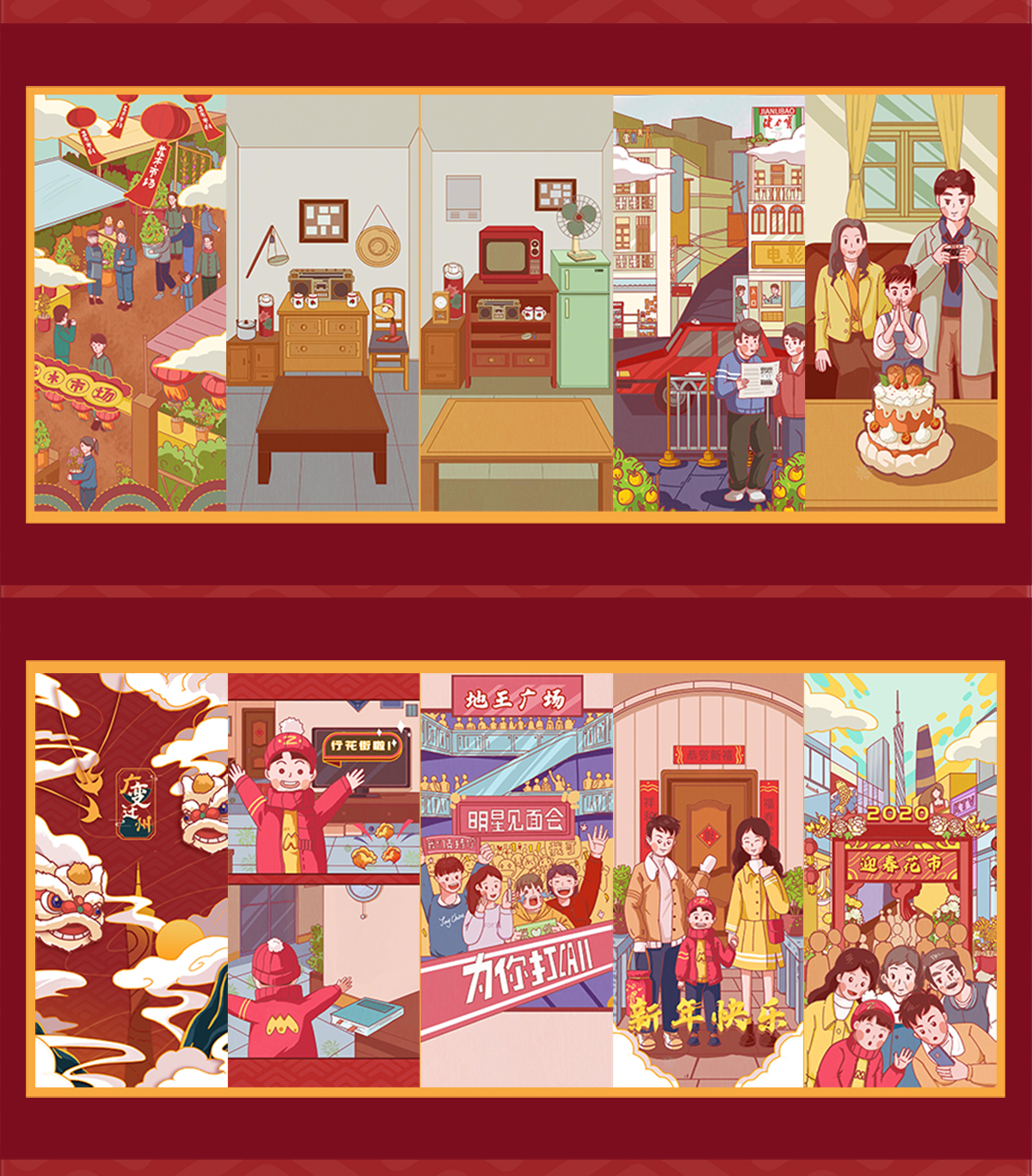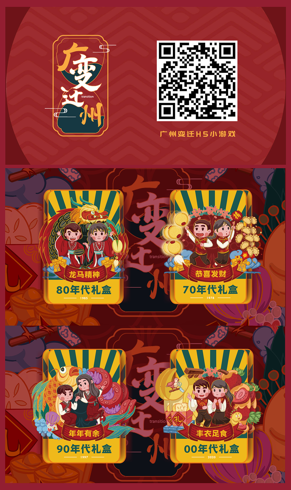 本作品围绕广州一家三代人70年代至今的生活,讲述了这一家人在不同时代的春节期间所发生的故事,并且以相片为线索,来展现广州的社会变迁。通过收集广州50年来的历史资料,提取标志性元素,编写故事剧情。展现广州改革开放以来的繁荣新生。为了让H5变得更加有趣,我们将形式设定为互动的小游戏,在不同年代设定了问题,选择选项,会生成年代标签。这样既能让人们了解到广州的变迁,也能与用户有了互动。