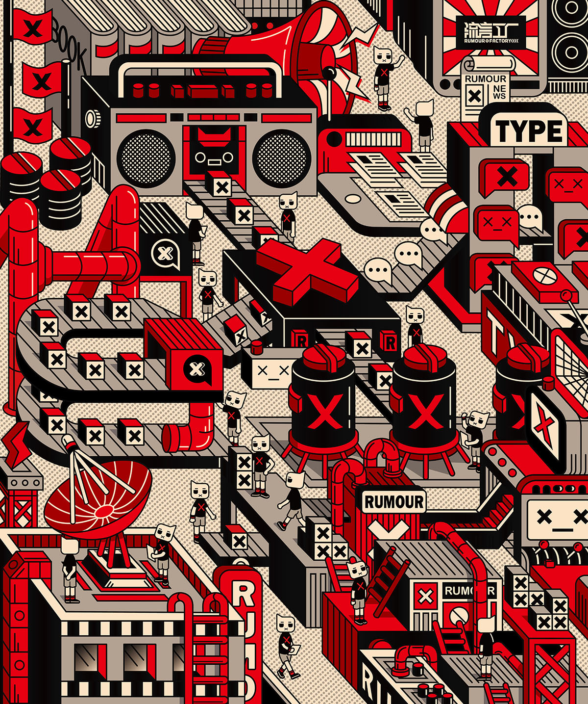 《流言工厂》是以流言为题材进行创作的主题系列设计,新媒体时代的到来,流言的传播渠道也变得越来越广,信息也越发缭乱,它给舆论环境造成很大的负面影响。对于这种现状,我想通过设立“流言工厂”这一主题来反映当今社会上的流言现象,并引发观众对于流言负面存在的思考。在本次毕业设计创作中,包含有插画、海报、动画视频等内容,插画主要描绘了九类流言制造者的形象,而海报则通过以图为主的方式来向大众传达有关于流言的相关资料,动画视频以简短的剧情来展现流言工厂的存在,通过以上几类设计内容来构造《流言工厂》的整体。