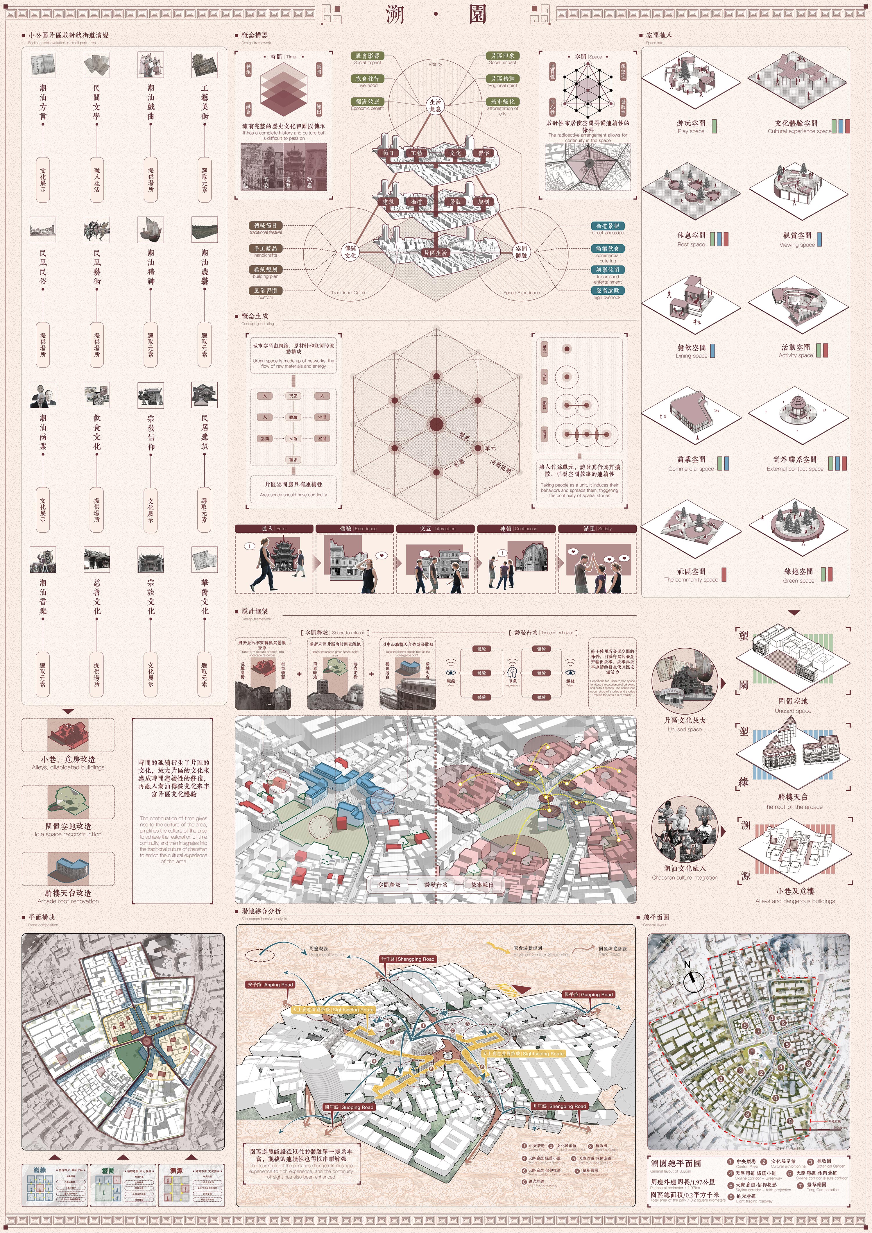 本方案在设计过程中主要以时间与空间连续性的修复为首要方向,通过对文化元素的提取,经过对片区内人群的调研选取需求,结合片区内空间的现状,总结出适合激活小公园片区活力的策略,从生活气息、传统文化、空间体验三个板块入手,将人作为单元诱发行为并扩散,引发时间空间的连续性。在方案中结合文化植入商业需求和节点,改善片区绿地及基础设施配套,丰富片区原真性体验,达到激活片区的目的。本次意图将将汕头小公园片区做一次实验性的改造,将历史街区重新作为文化核心,向外发散,向内凝聚,把潮汕的传统文化用新的方式展示给每一个不曾了解它的外地人,也留给每一个眷恋它的家乡人。
