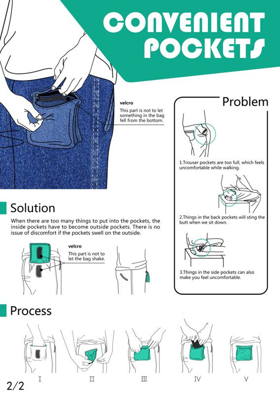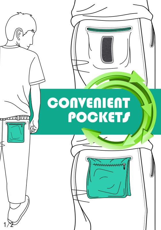 “Convenient pocket”设计是个便利的裤子口袋的设计。由于平时裤子口袋装很多东西时,坐下或者走路就会很不舒服。通过这个设计可以将裤袋由暗袋变明袋,设计的拉链可以增加袋子的安全性,上下部分的魔术帖也可以帮助袋子固定。如此使口袋露在外面就解决了问题,也可以使得使用者舒适。