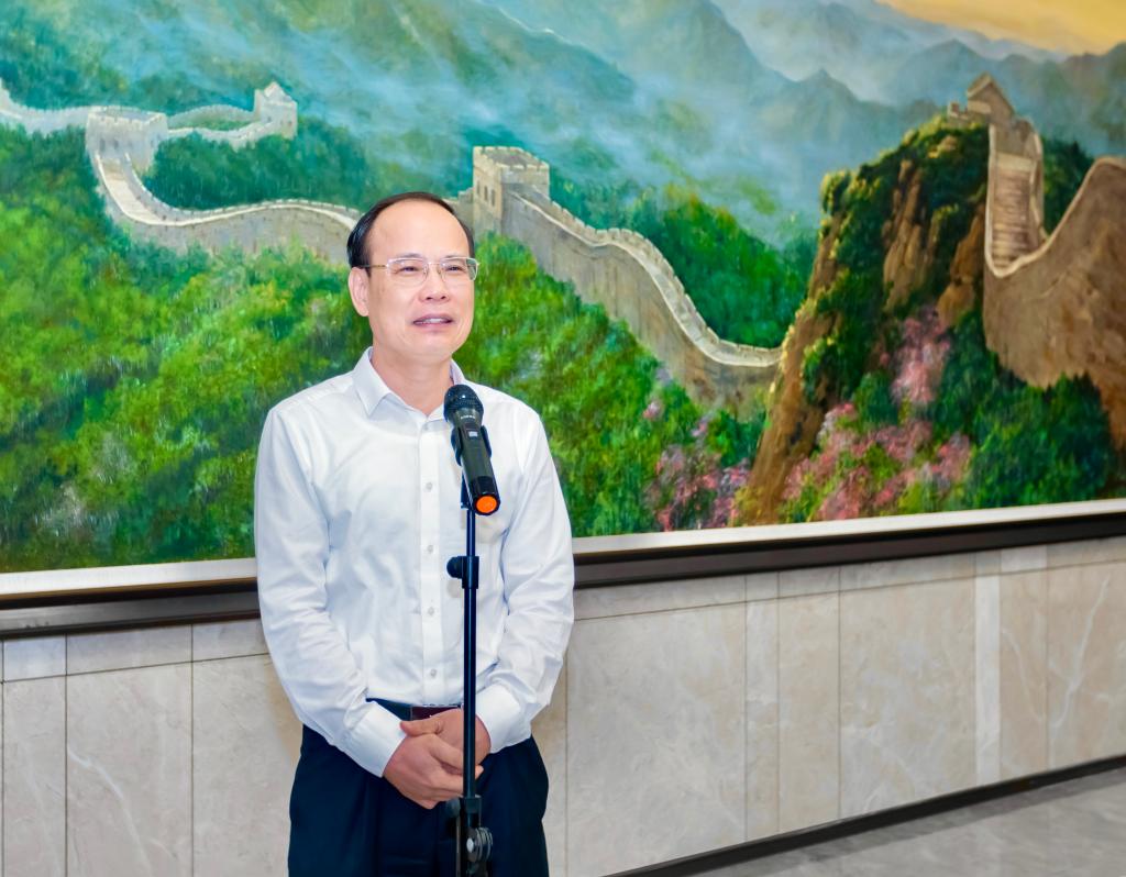 美术系教授、广州市美术家协会副主席张洪亮,介绍了创作历程以及作品采用的独特技法与万里长城、旭日东升等意象元素,由技入道、借物寓意,作品饱含了对国家繁荣富强、人民幸福安康、学校事业蓬勃发展的美好期许。