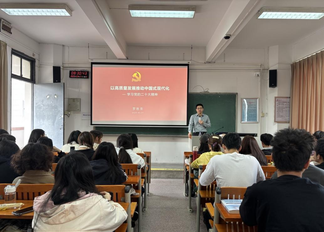 罗胜京围绕“走好中国式现代化之路”“准确把握高质量发展的科学内涵”“锚定高质量发展首要任务,奋力谱写高质量发展新篇章”“争做有理想、敢担当、能吃苦、肯奋斗的新时代好青年”四个方面展开讲述。围绕党的二十大赋予教育新的战略地位、历史使命和发展格局,结合党的二十届三中全会通过全面深化教育综合改革的决定,立足学校紧扣新一轮高质量发展主题推动建设高水平创新大学的工作实际,他指出广大艺设青年要勇于、敢于承担新时代下的重要使命和重大责任,一是要树立大局意识,从内心深处厚植对中国共产党的信赖、对中国特色社会主义的信心、对马克思主义的信仰;二是要把握时代发展脉搏,培育创新意识与创新能力,用设计新质力解码中国式现代化,赋能粤港澳湾区高质量发展;三是要满怀信心、自立自强,以实干为要,努力将自己打造为复合型、创新型、应用型人才。